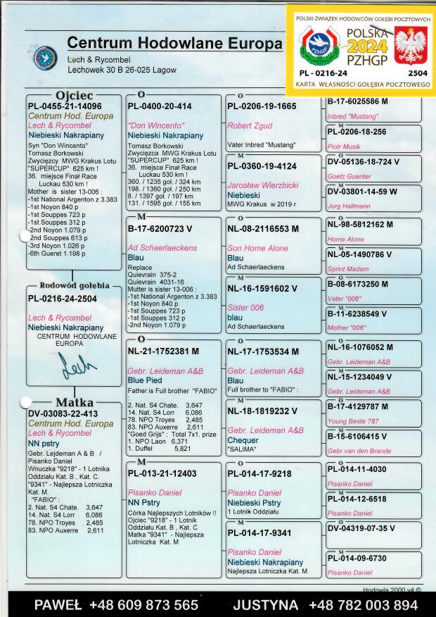 Więcej informacji o pochodzeniu gołębia w rodowodzie lub pod numerem telefonu :