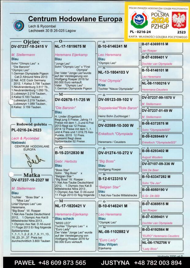 Więcej informacji o pochodzeniu gołębia w rodowodzie lub pod numerem telefonu :