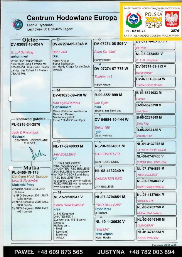 Więcej informacji o pochodzeniu gołębia w rodowodzie lub pod numerem telefonu :