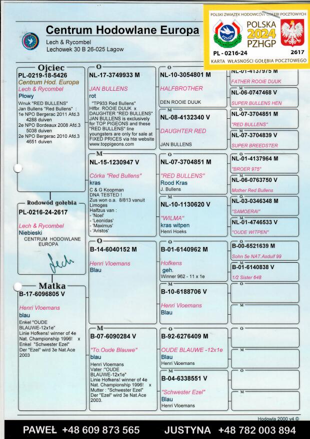 Więcej informacji o pochodzeniu gołębia w rodowodzie lub pod numerem telefonu :