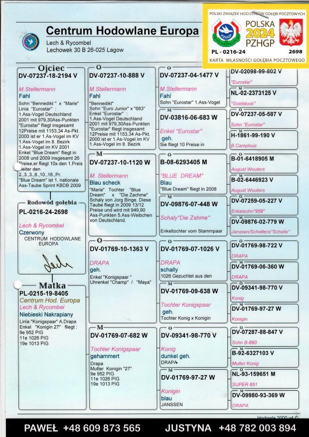 Więcej informacji o pochodzeniu gołębia w rodowodzie lub pod numerem telefonu :