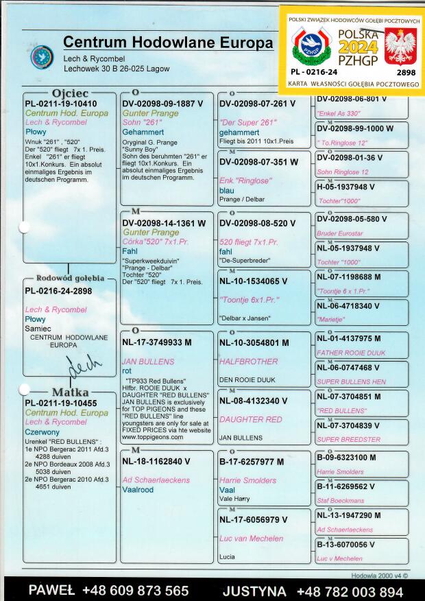 Więcej informacji o pochodzeniu gołębia w rodowodzie lub pod numerem telefonu :