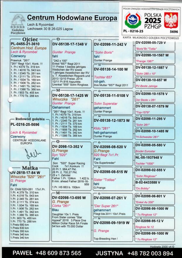 Więcej informacji o pochodzeniu gołębia w rodowodzie lub pod numerem telefonu :