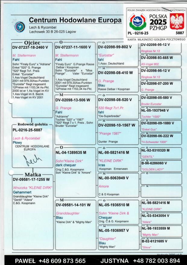 Więcej informacji o pochodzeniu gołębia w rodowodzie lub pod numerem telefonu :