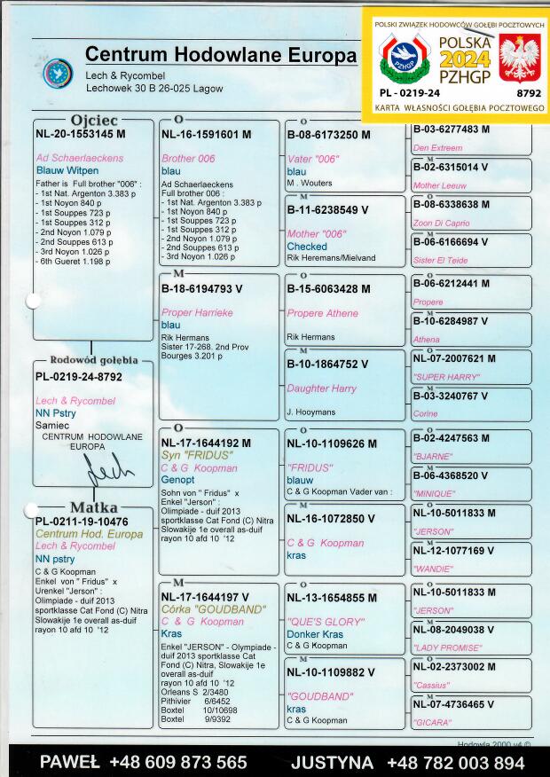 Więcej informacji o pochodzeniu gołębia w rodowodzie lub pod numerem telefonu :