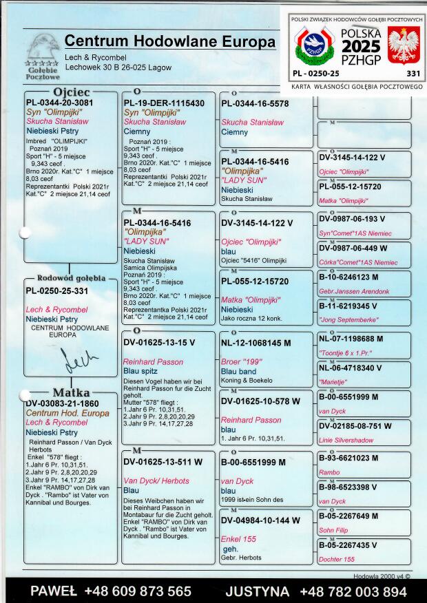 Więcej informacji o pochodzeniu gołębia w rodowodzie lub pod numerem telefonu :