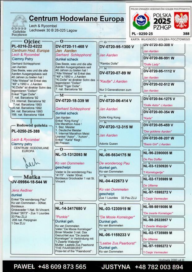 Więcej informacji o pochodzeniu gołębia w rodowodzie lub pod numerem telefonu :