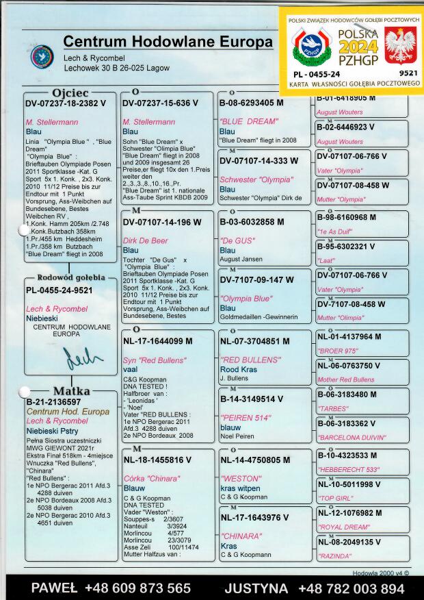 Więcej informacji o pochodzeniu gołębia w rodowodzie lub pod numerem telefonu :