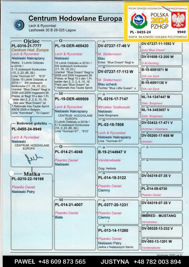 Więcej informacji o pochodzeniu gołębia w rodowodzie lub pod numerem telefonu :