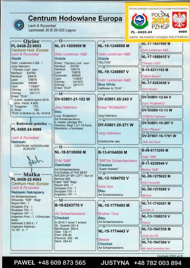 Więcej informacji o pochodzeniu gołębia w rodowodzie lub pod numerem telefonu :