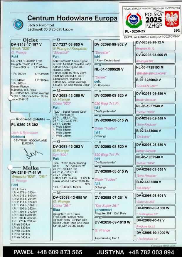 Więcej informacji o pochodzeniu gołębia w rodowodzie lub pod numerem telefonu :