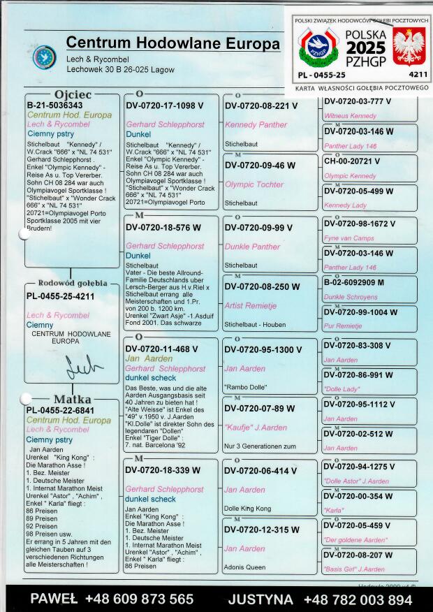 Więcej informacji o pochodzeniu gołębia w rodowodzie lub pod numerem telefonu :