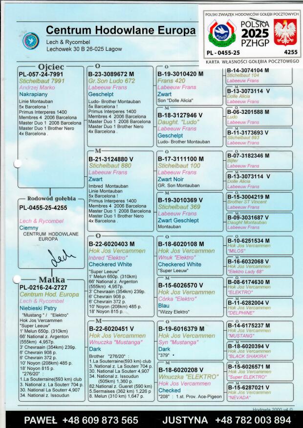 Więcej informacji o pochodzeniu gołębia w rodowodzie lub pod numerem telefonu :