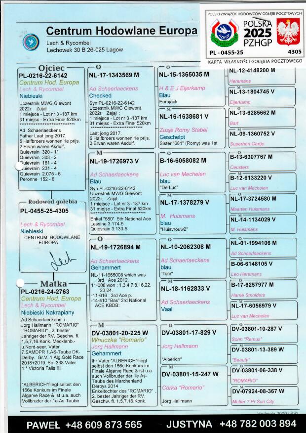 Więcej informacji o pochodzeniu gołębia w rodowodzie lub pod numerem telefonu :