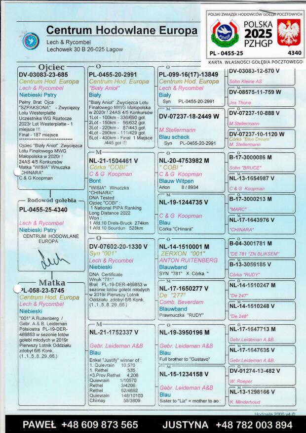 Więcej informacji o pochodzeniu gołębia w rodowodzie lub pod numerem telefonu :