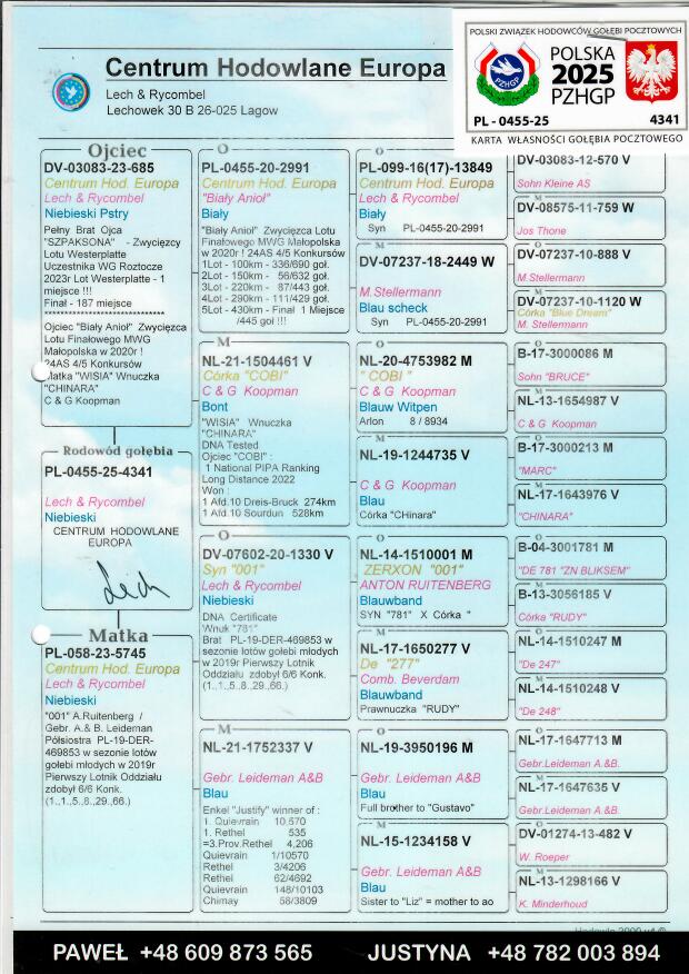 Więcej informacji o pochodzeniu gołębia w rodowodzie lub pod numerem telefonu :