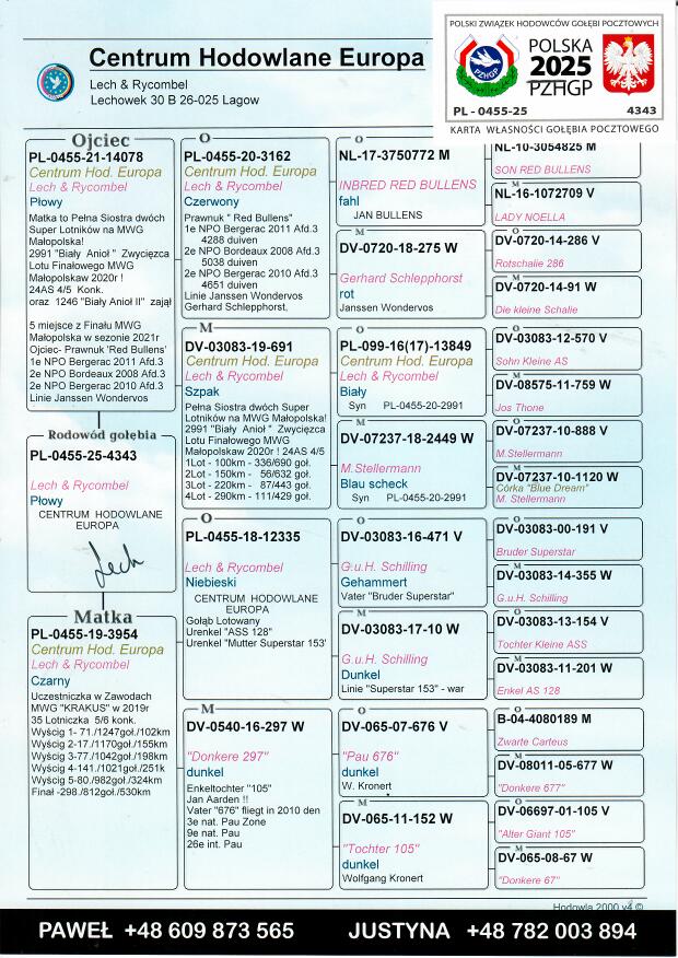 Więcej informacji o pochodzeniu gołębia w rodowodzie lub pod numerem telefonu :