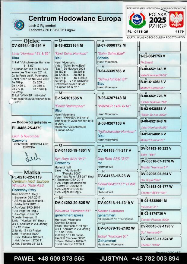 Więcej informacji o pochodzeniu gołębia w rodowodzie lub pod numerem telefonu :