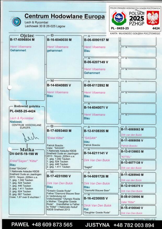 Więcej informacji o pochodzeniu gołębia w rodowodzie lub pod numerem telefonu :