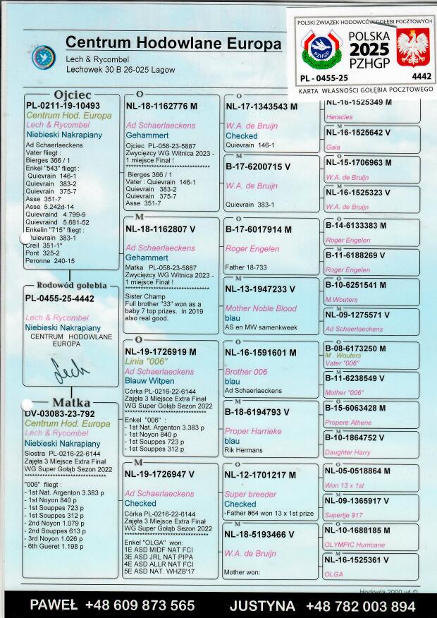 Więcej informacji o pochodzeniu gołębia w rodowodzie lub pod numerem telefonu :