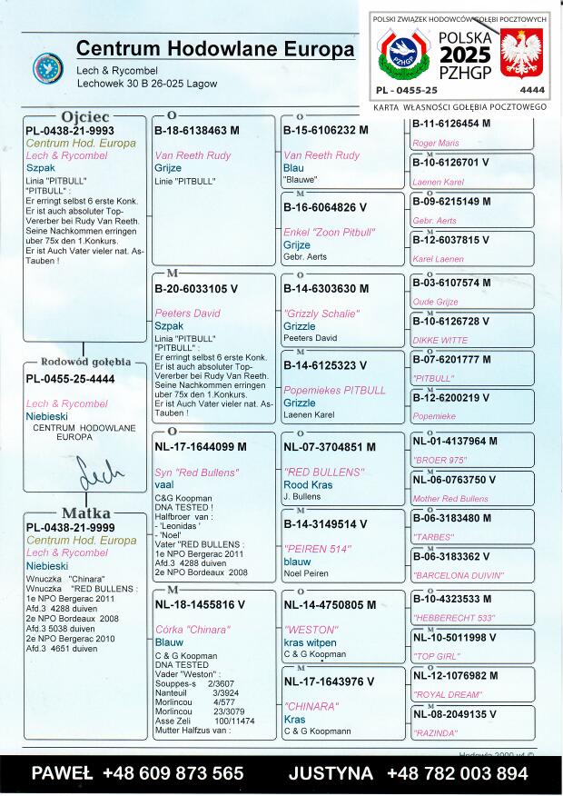 Więcej informacji o pochodzeniu gołębia w rodowodzie lub pod numerem telefonu :