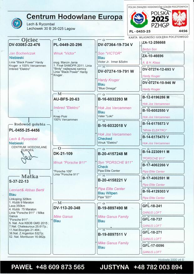 Więcej informacji o pochodzeniu gołębia w rodowodzie lub pod numerem telefonu :