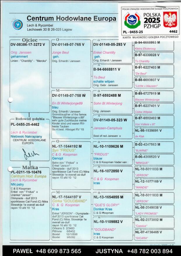 Więcej informacji o pochodzeniu gołębia w rodowodzie lub pod numerem telefonu :