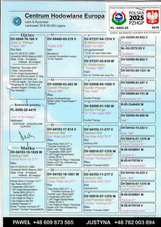 Więcej informacji o pochodzeniu gołębia w rodowodzie lub pod numerem telefonu :