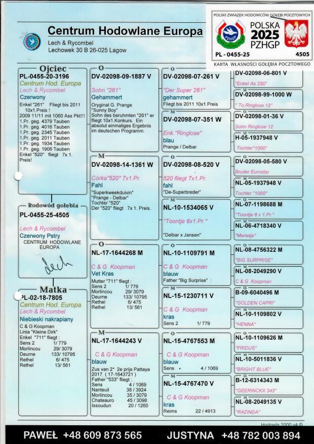 Więcej informacji o pochodzeniu gołębia w rodowodzie lub pod numerem telefonu :