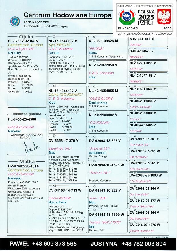 Więcej informacji o pochodzeniu gołębia w rodowodzie lub pod numerem telefonu :