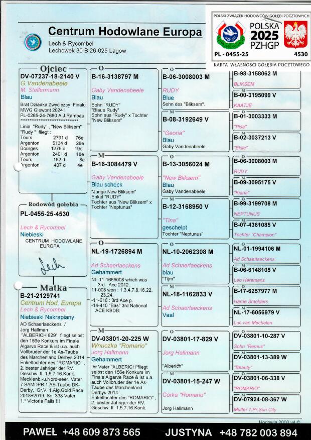 Więcej informacji o pochodzeniu gołębia w rodowodzie lub pod numerem telefonu :
