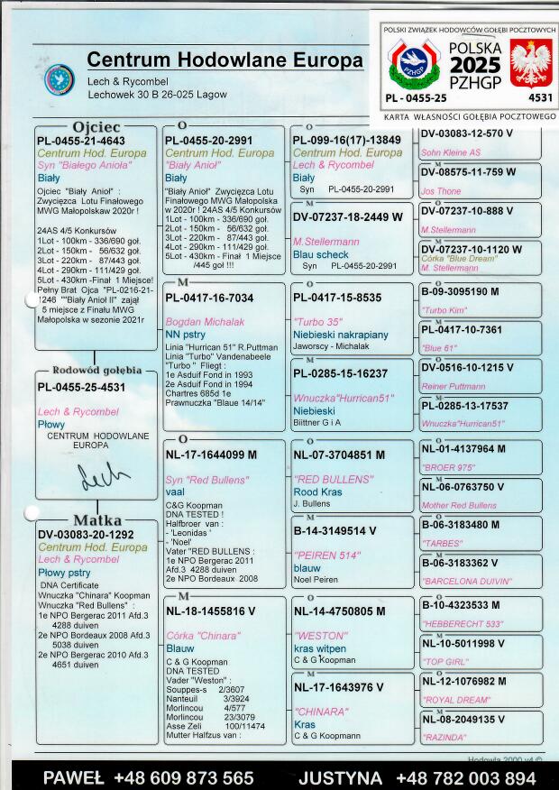 Więcej informacji o pochodzeniu gołębia w rodowodzie lub pod numerem telefonu :