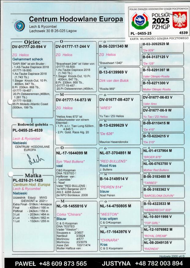 Więcej informacji o pochodzeniu gołębia w rodowodzie lub pod numerem telefonu :