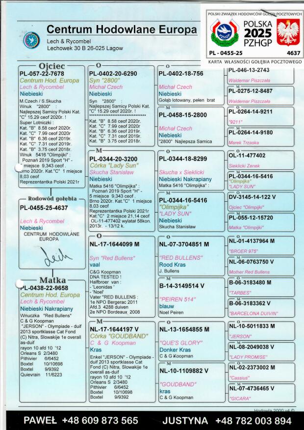 Więcej informacji o pochodzeniu gołębia w rodowodzie lub pod numerem telefonu :