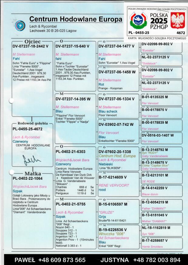Więcej informacji o pochodzeniu gołębia w rodowodzie lub pod numerem telefonu :