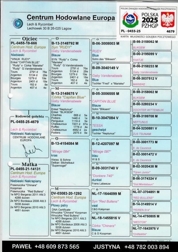 Więcej informacji o pochodzeniu gołębia w rodowodzie lub pod numerem telefonu :