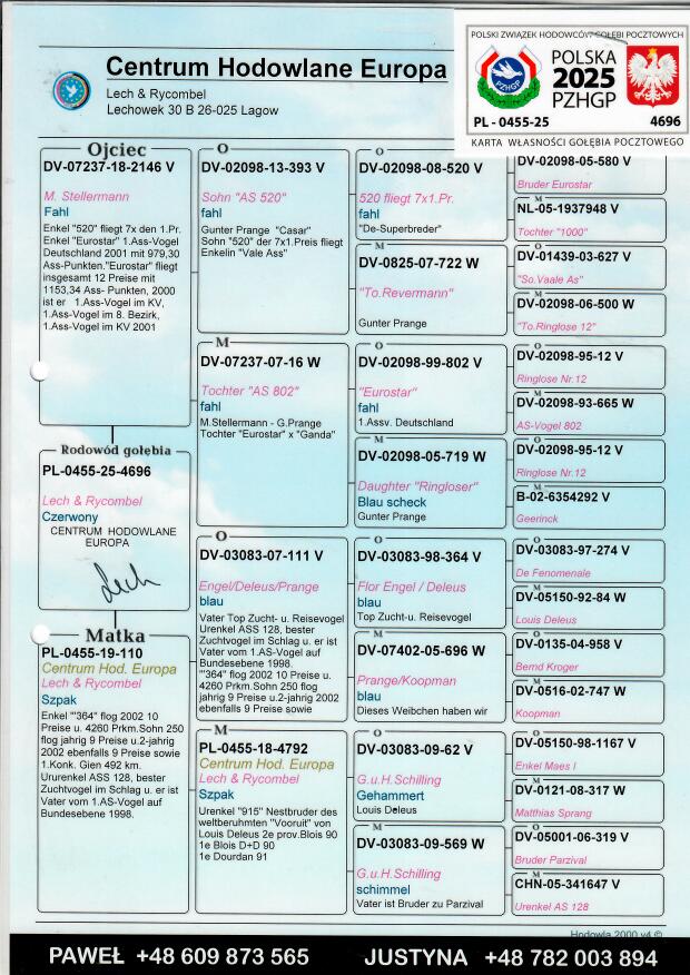 Więcej informacji o pochodzeniu gołębia w rodowodzie lub pod numerem telefonu :