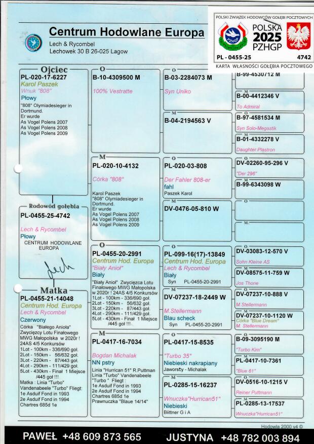 Więcej informacji o pochodzeniu gołębia w rodowodzie lub pod numerem telefonu :