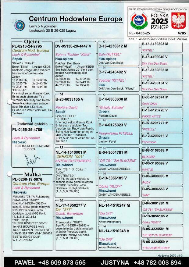 Więcej informacji o pochodzeniu gołębia w rodowodzie lub pod numerem telefonu :