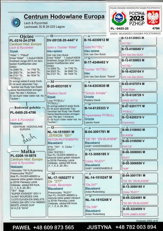 Więcej informacji o pochodzeniu gołębia w rodowodzie lub pod numerem telefonu :