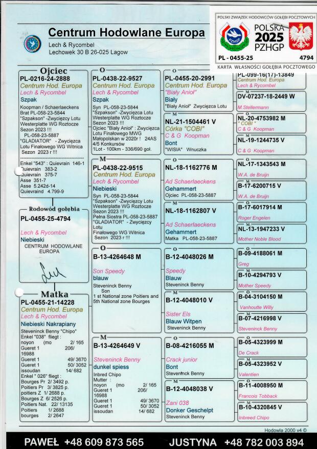 Więcej informacji o pochodzeniu gołębia w rodowodzie lub pod numerem telefonu :