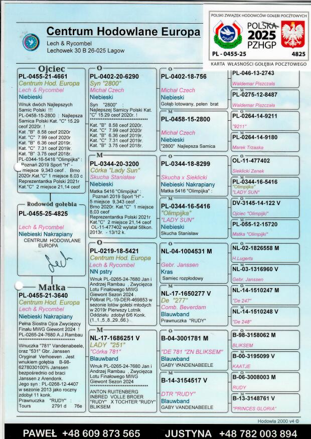 Więcej informacji o pochodzeniu gołębia w rodowodzie lub pod numerem telefonu :
