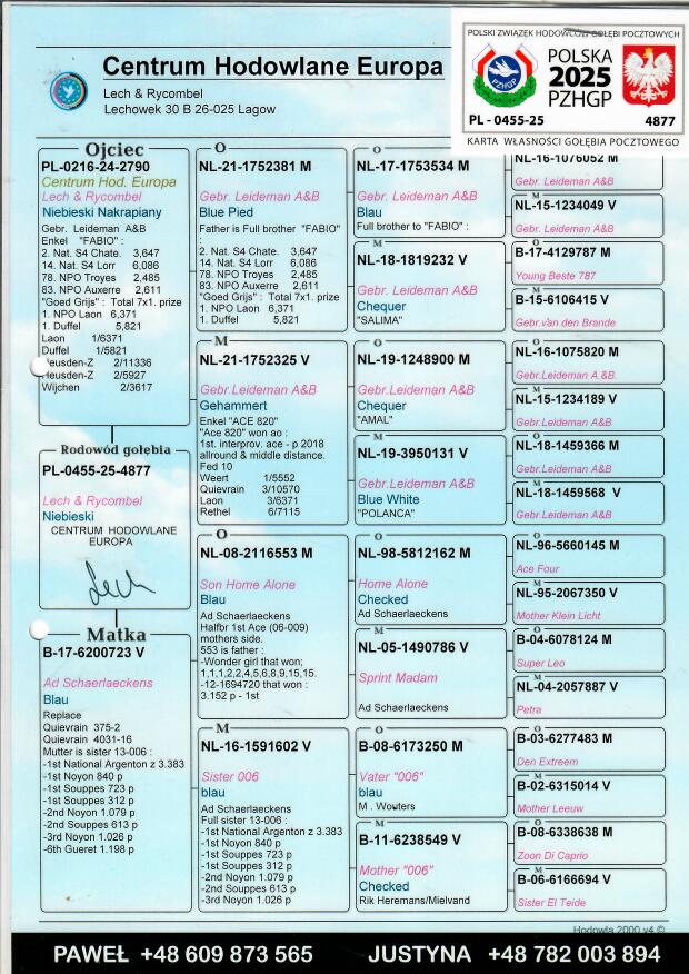Więcej informacji o pochodzeniu gołębia w rodowodzie lub pod numerem telefonu :