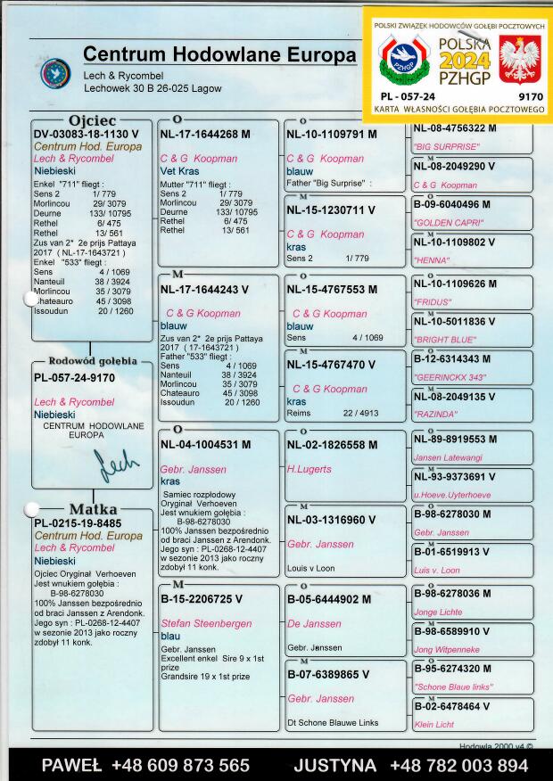 Więcej informacji o pochodzeniu gołębia w rodowodzie lub pod numerem telefonu :